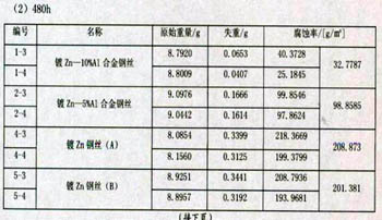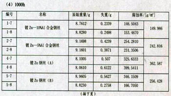 2、鍍鋅鋼絲隨時(shí)間的變化,表面由于氧化逐漸變?yōu)榛疑;熱?0%鋁鋅合金鋼絲隨時(shí)間變化,表面由于氧化逐漸變?yōu)楹谏?br /> 3、鋼絲隨著鍍層量的增加,耐腐蝕性能也增加。