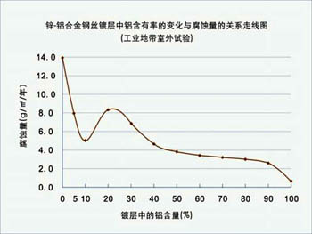 由試驗(yàn)結(jié)果可以看出,鍍層中鋁含量為10%的時(shí)候,腐蝕量為5g/m2/年。而鋁含量繼續(xù)上升的時(shí)候,腐蝕量反而升高,一直到鋁含量達(dá)到40%的時(shí)候,才又達(dá)到5g/m2/年。于是,就抗腐蝕的能力及經(jīng)濟(jì)的角度來(lái)說(shuō),用熱鍍10%鋁鋅合金鋼絲最為合適。